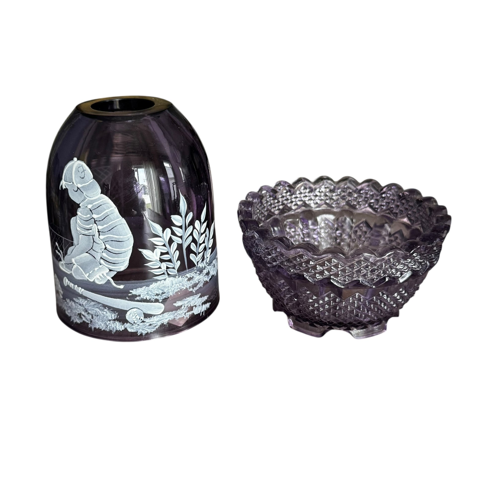 The piece consists of two parts: a textured amethyst glass base with a ruffled rim and a domed shade showcasing the detailed hand-painted figure. When lit, the rich purple glass glows beautifully, illuminating the painted scene with a soft, heartwarming light.