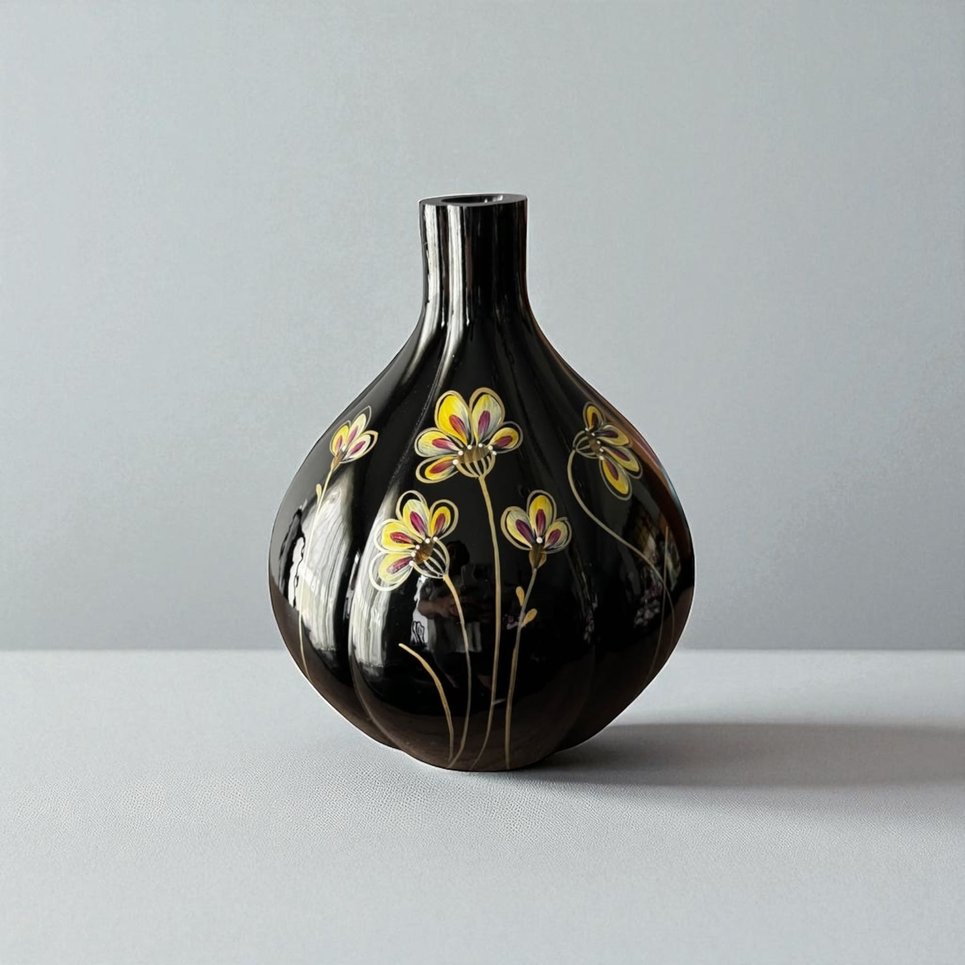 Fenton Art Glass Black Floral Melon Vase w/Original Sticker, Signed