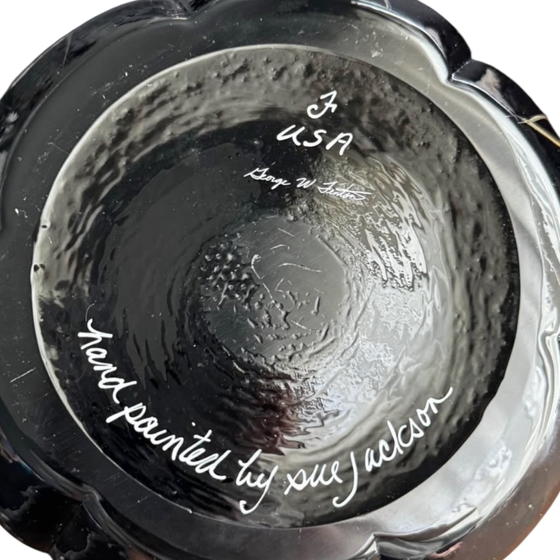 A gorgeous, unique Fenton piece signed by Sue Jackson. This vase has delicate yellow-orange flowers and a unique spouted top. Perfect condition!