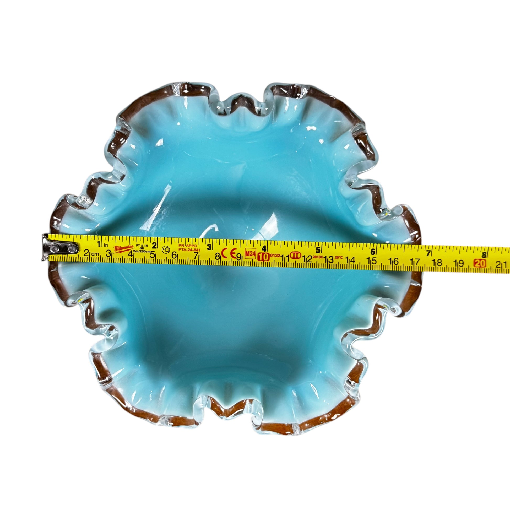 This very rare vintage set of Fenton Silver Crest bowls is crafted in luminous turquoise blue milk glass and finished with the iconic clear, ruffled crest that defines the pattern. The saturated color and glossy surface highlight the sculptural rippling along each rim, while the pairing of a pedestal bowl and a matching ruffled bowl creates visual balance and display versatility. Produced during Fenton’s mid-century era, this set captures the bold color experimentation and elegant form that collectors seek in 1950s American art glass. A striking and highly collectible duo ideal for curated vintage, retro, or mid-century glass displays.