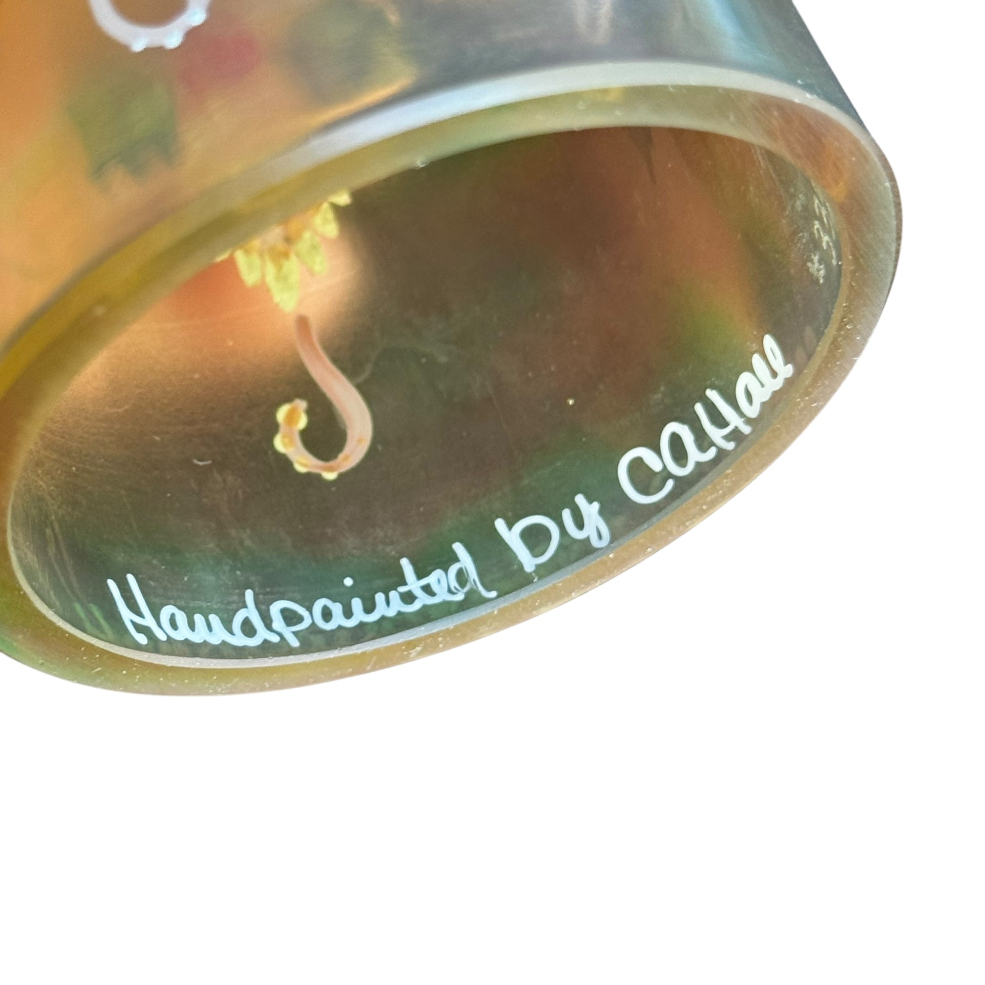 This Fenton “Iced Pinecones” fairy lamp glows with wintry elegance. Handcrafted in golden iridescent satin glass, the piece features hand-painted pinecones dusted in white and gold with delicate green leaves and red berries — a nod to the beauty of the winter season.