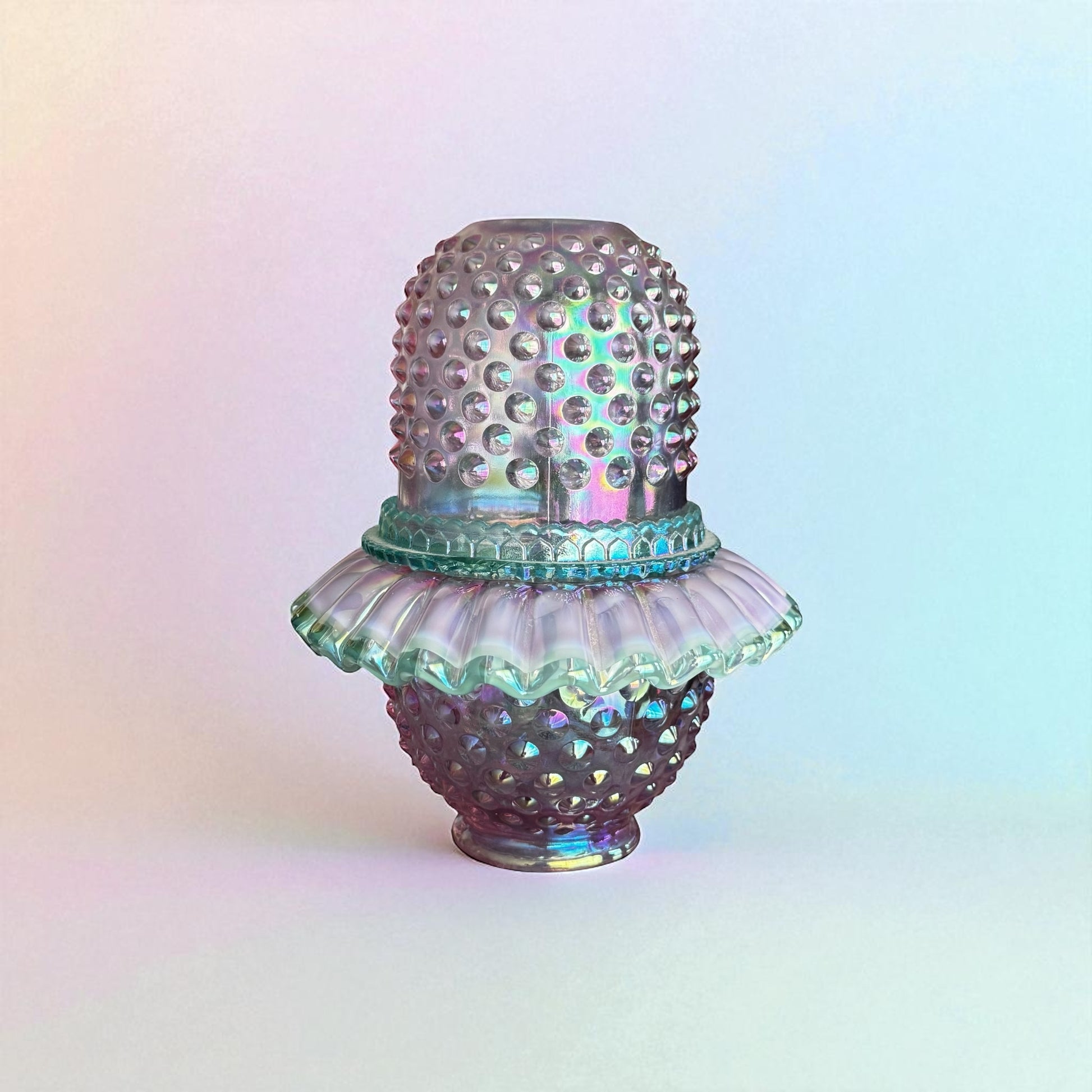 This is one of the PRETTIEST vintage fairy lamps from Fenton in my opinion. It has 3 pieces: the base, the glass insert, and cover. This specific lamp was designed by Shelly Fenton, the daughter of one of Fenton Art Glass' founders. The iridescence makes this piece GLOW in the sunlight and it casts a beautiful, dotted shadow along the wall when lit up. The middle insert on this piece is chipped on the rim - but it does not affect the item whatsoever. Price reflects this small flaw, but the lamp is otherwise in mint condition.